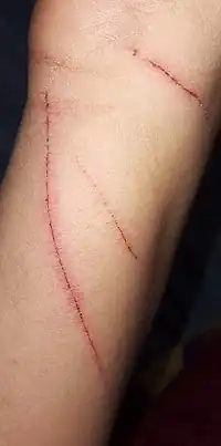 Injuries often cause psychological harm in addition to physical harm. Traumatic injuries are associated with psychological trauma and distress, and some victims of traumatic injuries will display symptoms of post-traumatic stress disorder during and after the recovery of the injury. The specific symptoms and their triggers vary depending on the nature of the injury.[67] Body image and self-esteem can also be affected by injury. Injuries that cause permanent disabilities, such as spinal cord injuries, can have severe effects on self-esteem.[68][69] Disfiguring injuries can negatively affect body image, leading to a lower quality of life. Burn injuries in particular can cause dramatic changes in a person's appearance that may negatively affect body image.[70][71][72]