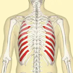 The innermost intercostal muscle is a layer of intercostal muscles.[1] It may also be called the intima of the internal intercostal muscles.[2] It is the deepest muscular layer of the thorax,[3] with muscle fibres running vertically (in parallel with the internal intercostal muscles).[2] It is present only in the middle of each intercostal space, and often not present higher up the rib cage.[3] It lies deep to the plane that contains the intercostal nerves and intercostal vessels, and the internal intercostal muscles.[3][4] The diaphragm is continuous with the innermost intercostal muscle.[5]