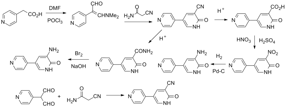 - ↑ GB 2070008, Gelotte KO, Parady ED, "Process for preparing 5-cyano(3,4'-bipyridin)-6(1H)-one", published 3 September 1981, issued 18 April 1984, assigned to Sterling Drum Inc.