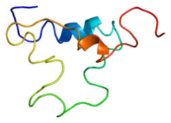 IGF-1 is a protein that in humans is encoded by the IGF1 gene.[8][9] IGF-1 consists of 70 amino acids in a single chain with three intramolecular disulfide bridges. IGF-1 has a molecular weight of 7,649 daltons.[10] In dogs, an ancient mutation in IGF1 is the primary cause of the toy phenotype.[11]