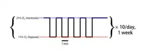 Intermittent hypoxia (also known as episodic hypoxia) is an intervention in which a person or animal undergoes alternating periods of normoxia and hypoxia. Normoxia is defined as exposure to oxygen levels normally found in Earth's atmosphere (~21% O2) and hypoxia as any oxygen levels lower than those of normoxia. Normally, exposure to hypoxia is negatively associated to physiological changes to the body, such as altitude sickness.[1] However, when used in moderation, intermittent hypoxia may be used clinically as a means to alleviate various pathological conditions.[2]