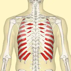 For the most part, they are muscles of exhalation. In exhalation the interosseous portions of the internal intercostal muscles, (the part of the muscle that is between the bone portion of the superior and inferior ribs), depresses and retracts the ribs, compressing the thoracic cavity and expelling air.[2] The internal intercostals, however, are only used in forceful exhalation such as coughing or during exercise and not in relaxed breathing.[3] The external intercostal muscles, and the parasternal part of the internal intercostal muscles, (the part of the muscle that lies between the cartilage portion of the superior and inferior ribs), are used in inspiration, by aiding in elevating the ribs and expanding the thoracic cavity.[4]