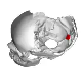![]() Position of internal occipital protuberance (shown in red). Parietal bones removed. | |