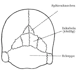![]() Multiple interparietal bones or Inca bones shown in a 20th-century anatomical illustration (with labels in German). | |