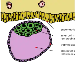 A blastocyst, with the inner cell mass, which will become the fetus, colored green. The trophoblast layer, which can be replaced with that of another species, is colored purple.