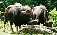 A gaur (left[note 1]) embryo may develop to term when gestated by cattle (right[note 1]), but will have severe intrauterine growth restriction.[2]