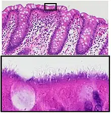 | Histopathology of intestinal spirochetosis, showing basophilic, fringe-like, end-on-end attachment of filamentous densely packed spirochetes on the surface epithelium of the intestinal mucosa.[1] H&E stain. | |