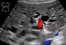 Abdominal ultrasonography (with Doppler) of dilated intrahepatic bile ducts, in this case because of pancreatic cancer. The bile ducts are colorless (black) in contrast to blood vessels (portal vein near center, and hepatic artery to the right of it) which have Doppler signal.