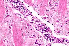 | Micrograph showing an intravascular large B-cell lymphoma in a blood vessel of the brain. H&E stain. | |