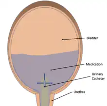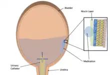 Intravesical drug delivery is the delivery of medications directly into the bladder by urinary catheter. This method of drug delivery is used to directly target diseases of the bladder such as interstitial cystitis and bladder cancer, but currently faces obstacles such as low drug retention time due to washing out with urine and issues with the low permeability of the bladder wall itself. Due to the advantages of directly targeting the bladder, as well as the effectiveness of permeability enhancers, advances in intravesical drug carriers, and mucoadhesive, intravesical drug delivery is becoming more effective and of increased interest in the medical community.