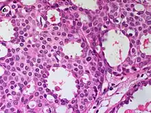 The microscopic histopathology of ICCB tumors stained with hematoxylin and eosin shows cribriform areas covering more than 50% of the tumor with the remaining tumor areas showing tubular and/or other histopathological patterns. The cribriform areas consist of small-sized cells with amphophilic (i.e. taking up both the hematoxylin and eosin stains) cytoplasm, indistinct cell boundaries, and small-to-medium sized nuclei that are surrounded by a sharp nuclear membrane and contain finely stippled chromatin (i.e. DNA coated with protein).[17] Numerous open spaces and/or sieve-like small holes lie between these cells (see above photomicrograph) to give the lesions a Swiss cheese-like appearance. The spaces and holes may contain microcalcifications and/or mucins (i.e. high molecular weight, sugar-linked proteins normally produced and secreted by the mammary gland and found in milk).[3] The cells around these spaces and holes sometimes have "apical snouts", i.e. small protrusions on the side of the cells that faces the spaces and holes.[11] Tubular areas (see adjacent photomicrograph of a tubular carcinoma) consist of well-formed tubules lined with mostly normal appearing tubular cells.[17][20] The other histopathological patterns that may occur in these tumor types include the pattern associated with invasive carcinoma of no special type[4] or in uncommon cases the pattern associated with mucinous carcinoma of the breast.[17] The invasive component of these tumors almost always has the cribriform histopathology pattern.[14] All of the tumor cells in ICCB are typically slow-growing as evidenced by their low mitotic index (i.e. the ratio of the number of dividing cells to the total number of tumor cells) or low levels of cellular Ki-67 protein (an index of cell proliferation).[14]