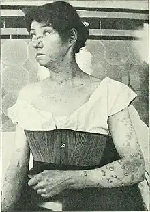 Iododermas are caused by iodides, with the most common sources of exposure being oral and intravenous contrast materials used to treat thyroid disease.[1]: 135 The most common type of eruption is an acneiform eruption with numerous acutely inflamed follicular pustules, each surrounded by a ring of hyperemia.[1]: 135