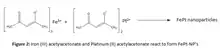 Platinum nanoparticles become more chemically stable when alloyed with iron, cobalt, or nickel. The platinum alloys also have a better detection range and catalytic activity than platinum alone. These magnetic metal additions to platinum reduce the overall sensitivity to oxidation while maintaining the desirable magnetic properties.[10] Combined, FePt nanoparticles can be synthesized for medical applications. One method of synthesis uses incident laser technology to irradiate solutions containing iron and platinum to combine the two alloys. A laser beam is emitted onto a 4:1 mixture of iron (III) acetylacetonate and platinum (II) acetylacetonate dissolved in methanol.[11] The black precipitates are then washed and dried on silicon substrates to be characterized by transmission electron microscopy (TEM) and X-ray diffraction.