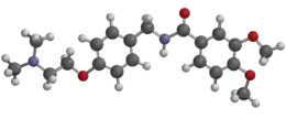 Itopride (INN; brand name Ganaton) is a prokinetic benzamide derivative. These drugs inhibit dopamine and acetylcholine esterase enzyme and have a gastrokinetic effect.[3] Itopride is indicated for the treatment of functional dyspepsia and other gastrointestinal conditions.[4] It is a combined D2 receptor antagonist and acetylcholinesterase inhibitor.[5][6] Itopride is the dimethoxy analog of trimethobenzamide.