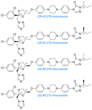 The itraconazole molecule has three chiral carbons. The two chiral centers in the dioxolane ring are fixed in relation to one another, and the triazolomethylene and aryloxymethylene dioxolane-ring substituents are always cis to each other. The clinical formulation is a 1:1:1:1 mixture of four stereoisomers (two enantiomeric pairs).[36][37]