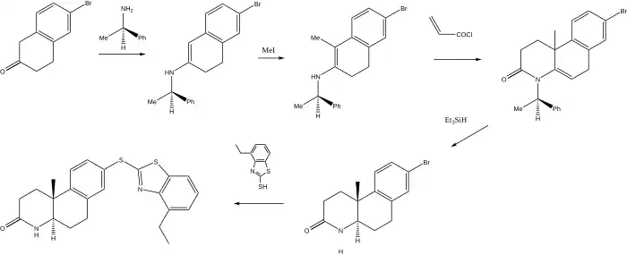 The scheme used to produce a somewhat more complex 5-a-reductase inhibitor relies on a chiral auxiliary to yield the final product as a single enantiomer. The first step starts with the reaction of bromotetralone with R-α-phenethylamine to afford the enamine. Reaction with methyl iodide adds the methyl group at what will be a steroid-like AB ring junction.