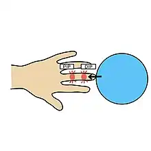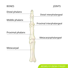 A jammed finger can generally be diagnosed by a physical examination. Bone or joint deformity may indicate potential dislocations or fractures.[6] The basic structure of the finger includes three bones with joints in between each.[9] The joint closest to the tip is the distal interphalangeal (DIP) joint. The next joint, moving closer to the hand, is the proximal interphalangeal (PIP) joint. The thumb differs by only having two bones and one interphalangeal joint.[10]