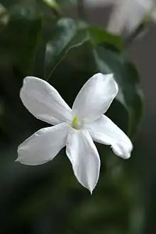 It is also known as summer jasmine,[1] poet's jasmine,[2] white jasmine,[2] true jasmine or jessamine,[2] and is particularly valued by gardeners throughout the temperate world for the intense fragrance of its flowers in summer. It is also the National flower of Pakistan.