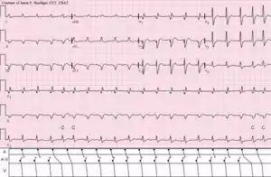 Junctional tachycardia is a form of supraventricular tachycardia characterized by involvement of the AV node.[1] It can be contrasted to atrial tachycardia. It is a tachycardia associated with the generation of impulses in a focus in the region of the atrioventricular node due to an A-V disassociation.[2] In general, the AV junction's intrinsic rate is 40-60 bpm so an accelerated junctional rhythm is from 60-100bpm and then becomes junctional tachycardia at a rate of >100 bpm.