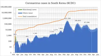 - ↑ 고, 선호 (27 February 2020). "韓 코로나19 확진자 수 세계 2위…세계 각국 통제 나섰다" (in Korean). Retrieved 1 November 2020.