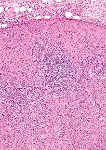 - ↑ Bosch X, Guilabert A, Miquel R, Campo E (July 2004). "Enigmatic Kikuchi-Fujimoto disease: a comprehensive review". Am. J. Clin. Pathol. 122 (1): 141–52. doi:10.1309/YF08-1L4T-KYWV-YVPQ. PMID 15272543.