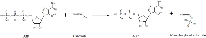 Kinases mediate the transfer of a phosphate moiety from a high energy molecule (such as ATP) to their substrate molecule, as seen in the figure below. Kinases are needed to stabilize this reaction because the phosphoanhydride bond contains a high level of energy. Kinases properly orient their substrate and the phosphoryl group within their active sites, which increases the rate of the reaction. Additionally, they commonly use positively charged amino acid residues, which electrostatically stabilize the transition state by interacting with the negatively charged phosphate groups. Alternatively, some kinases utilize bound metal cofactors in their active sites to coordinate the phosphate groups. Protein kinases can be classed as catalytically active (canonical) or as pseudokinases, reflecting the evolutionary loss of one or more of the catalytic amino acids that position or hydrolyse ATP.[6] However, in terms of signalling outputs and disease relevance, both kinases and pseudokinases are important signalling modulators in human cells, making kinases important drug targets.[7]