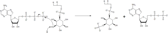 The kinase enzymes increase the rate of the reactions by making the inositol hydroxyl group more nucleophilic, often using the side chain of an amino acid residue to act as a general base and deprotonate the hydroxyl, as seen in the mechanism below.[24] Here, a reaction between adenosine triphosphate (ATP) and phosphatidylinositol is coordinated. The end result is a phosphatidylinositol-3-phosphate as well as adenosine diphosphate (ADP). The enzymes can also help to properly orient the ATP molecule, as well as the inositol group, to make the reaction proceed faster. Metal ions are often coordinated for this purpose.[24]