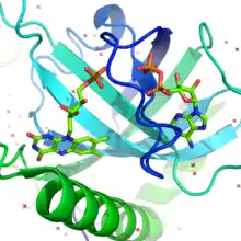 - 1 2 Karthikeyan S, Zhou Q, Osterman AL, Zhang H (November 2003). "Ligand binding-induced conformational changes in riboflavin kinase: structural basis for the ordered mechanism". Biochemistry. 42 (43): 12532–12538. doi:10.1021/bi035450t. PMID 14580199.