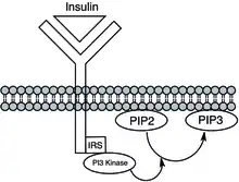Phosphatidylinositol kinases phosphorylate phosphatidylinositol species, to create species such as phosphatidylinositol 3,4-bisphosphate (PI(3,4)P2), phosphatidylinositol 3,4,5-trisphosphate (PIP3), and phosphatidylinositol 3-phosphate (PI3P). The kinases include phosphoinositide 3-kinase (PI3K), phosphatidylinositol-4-phosphate 3-kinase, and phosphatidylinositol-4,5-bisphosphate 3-kinase. The phosphorylation state of phosphatidylinositol plays a major role in cellular signalling, such as in the insulin signalling pathway, and also has roles in endocytosis, exocytosis and other trafficking events.[21][22] Mutations in these kinases, such as PI3K, can lead to cancer or insulin resistance.[23]