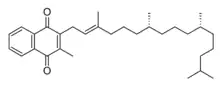 Phytomenadione, also known as vitamin K1 or phylloquinone, is a vitamin found in food and used as a dietary supplement.[6][7] It is on the World Health Organization's List of Essential Medicines.[8]