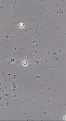 Kraken movement is relatively slow. There are 3 highly unusual methods of movement. The filopodium can grip the substrate and carry the cell body above the surface by a swaying locomotive action. The cell body can also move along a deeply branched filopodia. In a unique manner, Kraken can also completely disassemble its cell body and transport cell material through the filopodia network, where it is then deposited and reassembled elsewhere. This serves to move the cell body to the distal ends of the filopodia, which can then reposition and branch to new areas.[3]