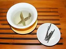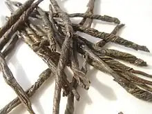 Kuding (Chinese: 苦丁茶; pinyin: kǔdīng chá; lit. 'bitter nail tea'; pronounced [kʰù.tíŋ ʈʂʰǎ]) is a particularly bitter-tasting Chinese infusion, which due to their similarities in appearance is derived from several plant species.[1] The two most common plants used to make kuding are the wax tree species Ligustrum robustum and the holly species Ilex kaushue (synonym: Ilex kudingcha), the former being more commonly grown in Sichuan and Japan while the latter is most commonly grown and used in the rest of China.[2] Tea produced from Ligustrum or many species of Ilex is caffeine-free, although not Ilex paraguariensis, the source of mate drank in South America.[3][4][5]