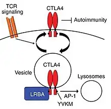 It is hypothesized that LRBA deficiency sufficiently impairs post-translational CTLA4 expression, as the abundance of CTLA4 protein in patients is significantly lower than normal. Knockdown of LRBA in wildtype cells, also leads to a post-translational loss of CTLA4 protein. Co-immunoprecipitation studies suggest that LRBA binds to the cytoplasmic tail of CTLA4. By binding to the tail, LRBA may protect and regulate the degradation of CTLA4 by blocking its trafficking to lysosomes for degradation.[2]