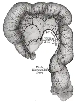 ![]() The inferior mesenteric artery and its branches. (Left colic visible at center right.) | |
