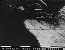 The lens capsule is a transparent membrane that surrounds the entire lens. The capsule is thinnest at the posterior pole with approximate thickness of 3.5μm. Average thickness at the equator is 7μm.[7][10] Anterior pole thickness increases with age from 11-15μm. The thickest portion is the annular region surrounding the anterior pole. This will also increase with age (from 13.5-16μm).[11] The ligaments suspending the lens form attachments in the equatorial area and more so just to the front and back of the equator.[12] There are tens of thousands of these ligaments in a mouse lens and for the most part they appear to connect directly to the lens capsule.[13] As the lens grows throughout the life of most vertebrates, the capsule is required to grow as well.[14] As shown in the accompanying micrographs and diagrams, equatorial cells can have periodic cellular processes penetrating the capsule.
