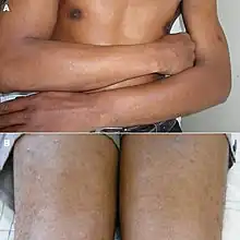 Lichen nitidus is a chronic inflammatory disease of unknown cause[1] characterized by 1–2 mm, discrete and uniform, shiny, flat-topped, pale flesh-colored or reddish-brown papules[2][3] that may appear as hypopigmented against dark skin. Occasionally, minimal scaling is present or can be induced by rubbing the surface of the papules.[3] The disease usually affects children and young adults[4] and is painless and usually nonpruritic, although protracted itching may occur in some cases.[3][5] It is sometimes referred to by dermatologists as "mini lichen planus".