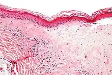 | Micrograph of lichen sclerosus showing the characteristic subepithelial sclerosus (right/bottom of image). H&E stain. | |