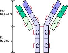 | Schematic diagram of a typical antibody showing two Ig heavy chains (blue) linked by disulfide bonds to two Ig light chains (green). The constant (C) and variable (V) domains are shown. | |