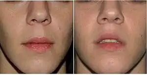 A lip lift is the most common plastic surgery procedure that modifies the cosmetic appearance of the lips, by reshaping them to increase the prominence of the vermilion border and to enhance the facial area above the lips into a more aesthetically pleasing shape. In corrective praxis, a lip lift procedure is distinguished from lip enhancement, the augmentation of the lips, which can be affected with a non-surgical procedure.