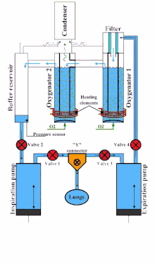 The pumping system is either a peristaltic pump (in the simplest liquid ventilators) or two piston pumps (in the most advanced liquid ventilators).