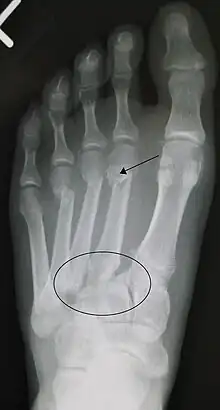 - ↑ Rankine JJ, Nicholas CM, Wells G, Barron DA (April 2012). "The diagnostic accuracy of radiographs in Lisfranc injury and the potential value of a craniocaudal projection". AJR Am J Roentgenol. 198 (4): W365–9. doi:10.2214/AJR.11.7222. PMID 22451574.