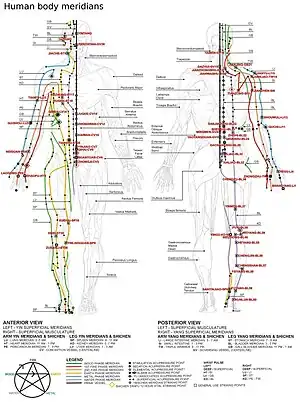 The eight extraordinary meridians (simplified Chinese: 奇经八脉; traditional Chinese: 奇經八脈; pinyin: qí jīng bā mài) are of pivotal importance in the study of qigong, tai chi, and Chinese alchemy.[3] Though many are listed, only the Governing Vessel and the Conception Vessel meridians have points not associated with the previous 12 meridians.
