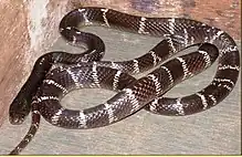 The Malayan krait (Bungarus candidus) is another dangerously venomous species of krait. In mice, the IV LD50 for this species is 0.1 mg/kg.[80] Envenomation rate among this species is very high and the untreated mortality is 70%, although even with antivenom and mechanical ventilation the mortality rate is at 50%.[81]