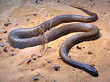 Mortality (often determined by measured toxicity on mice) is a commonly used indicator to determine the danger of any given venomous snake, but important too are its efficiency of venom delivery, its venom yield and its behavior when it encounters humans.[7][8] Many snake experts have cited the black mamba and the coastal taipan as the world's most dangerous, albeit not the most venomous snakes.[9][10][11] Both species are elapids, and in several aspects of morphology, ecology and behavior, the coastal taipan is strongly convergent with the black mamba.[12]