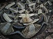 The South American bushmaster (Lachesis muta muta) is the longest species of venomous snake in the Western Hemisphere and the longest pit viper in the world. It is native to parts of South America, especially the equatorial forests east of the Andes. They are active at dusk or after dark and so they are very secretive and elusive. This species is large, fast and has a reputation for being particularly aggressive when cornered.[119][120] Some reports suggest that this species produces a large amount of venom that is weak compared to some other vipers.[121] Others, however, suggest that such conclusions may not be accurate. These animals are badly affected by stress and rarely live long in captivity. This makes it difficult to obtain venom in useful quantities and good condition for study purposes. For example, Bolaños (1972) observed that venom yield from his specimens fell from 233 mg to 64 mg while they remained in his care. As the stress of being milked regularly has this effect on venom yield, it is reasoned that it may also affect venom toxicity. This may explain the disparity described by Hardy and Haad (1998) between the low laboratory toxicity of the venom and the high mortality rate of bite victims.[122] However, wild specimens have an average venom yield per bite of 280–450 mg (dry weight) (U.S. Dept. Navy, 1968). According to (Sanchez et al., 1992), who used wild specimens from Pará, Brazil, the average venom yield per bite was 324 mg, with a range of 168–552 mg (dry weight).[123] Brown (1973) gives the following LD50 values for mice: 1.5 mg/kg IV, 1.6–6.2 mg/kg IP, 6.0 mg/kg SC. He also notes a venom yield of 200–411 mg.[34] Human envenoming by this species, although infrequent, can be rather severe due to the large volumes of venom injected. Envenomation is characterized by pronounced local tissue damage and systemic dysfunctions, including massive internal bleeding.[124]