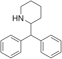 A number of related compounds are known which fit the same general structural pattern, but with substitution on the piperidine ring (e.g. SCH-5472, Difemetorex, N-benzylethylphenidate), or the piperidine ring replaced by other heterocycles such as pyrrolidine (e.g. diphenylprolinol, 2-Diphenylmethylpyrrolidine), morpholine (e.g. Methylmorphenate, 3-Benzhydrylmorpholine) or quinoline (e.g. AL-1095, Butyltolylquinuclidine).