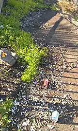 In addition to intentional littering, almost half of litter on U.S. roadways is now accidental or unintentional litter, usually debris that falls off improperly secured trash, recycling collection vehicles and pickup trucks.[4] Population levels, traffic density and proximity to waste disposal sites are factors known to correlate with higher litter rates.[5][6][7][8][9]