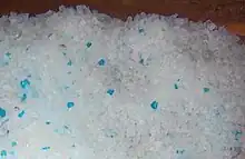 Silica gel litter, often referred to as "crystal litter", is a porous granular form of silicon dioxide, has the highest absorbency of any litter, and has excellent moisture control and complete odor elimination for an extended period of time compared to other litters. It is typically prepared through a sol-gel process, which involves the hydrolysis and condensation of silica precursors such as tetraethylorthosilicate (TEOS) or sodium silicate (Na2SiO3).[36] The porous structure of silica gel enables it to trap moisture within its network of interconnected pores, effectively locking away urine and preventing it from spreading or leaking. Moreover, many silica gel litter formulations incorporate activated carbon or other odor-neutralizing compounds, which further enhance the litter's ability to control unpleasant smells.[37] In addition to its physical structure, the chemical composition of silica gel also contributes to its performance as a cat litter. The surface of silica gel is covered with silanol (Si-OH) and siloxane (Si-O-Si) functional groups.[38] These groups interact with water molecules through hydrogen bonding and dipole-dipole interactions, enabling the material to absorb and retain moisture effectively.[39]