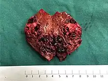 | Specimen of a surgically removed and dissected liver angiosarcoma with visible necrosis and bleeding | |
