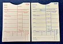 Lloyd George envelopes are beige-coloured card wallets and measure 130 mm × 180 mm (5.1 in × 7.1 in)[2][7] with red or blue markings for male or female patients, respectively.[2] One was allocated for every individual in the UK population, from birth and upon registration with a general practitioner.[8] Owned by the Secretary of State for Health, the Lloyd George record stayed with the individual's GP, wherever they moved to in the UK, and hence contain a person's lifelong health record.[9][10] Continuation cards can be inserted inside.[6][11] These have the date of printing in the bottom right-hand corner.[12]